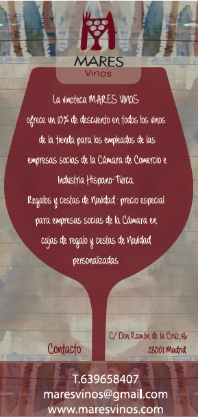 ***MARES VINOS, tüm dükkanlarında Türk-İspanyol Resmi Sanayi ve Ticaret Odası üyesi şirketlerin çalışanlarına yüzde 10 oranında indirim sunuyor.Noel hediye ve sepetleri: Kişiye özel hediye kutuları ve Noel sepetlerinde Oda üyesi şirketler için özel fiyatlar.