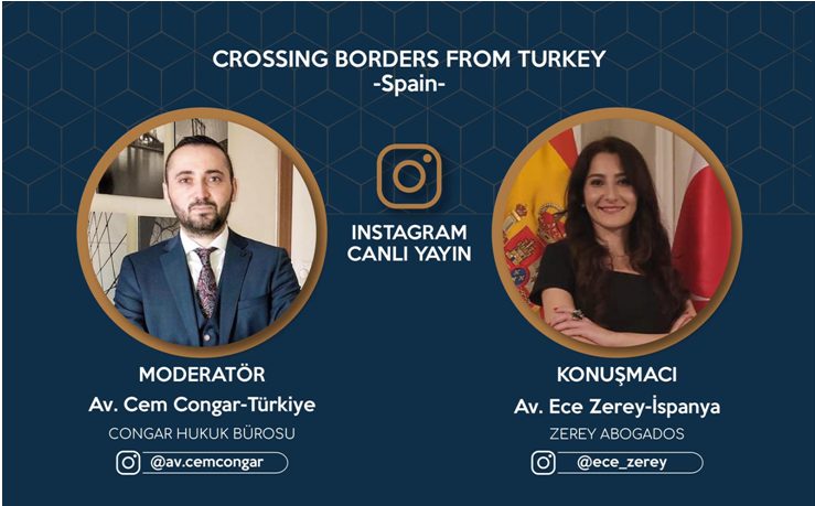 ECE ZEREY ABOGADOS hukuk bürosu ve danışmanlık şirketinin kurucusu olan İstanbul ve Madrid Barolarına kayıtlı Avukat Ece Zerey ve Congar Hukuk Bürosu kurucusu Av. Cem Congar, 25.05.2020 tarihinde İspanya’da hukuk eğitimi, avukatlık mesleği ve oturum izinleri ile alakalı uzun bir söyleşi gerçekleştirdi. Söyleşi avukatların Instagram kanallarından canlı olarak yayınlandı.